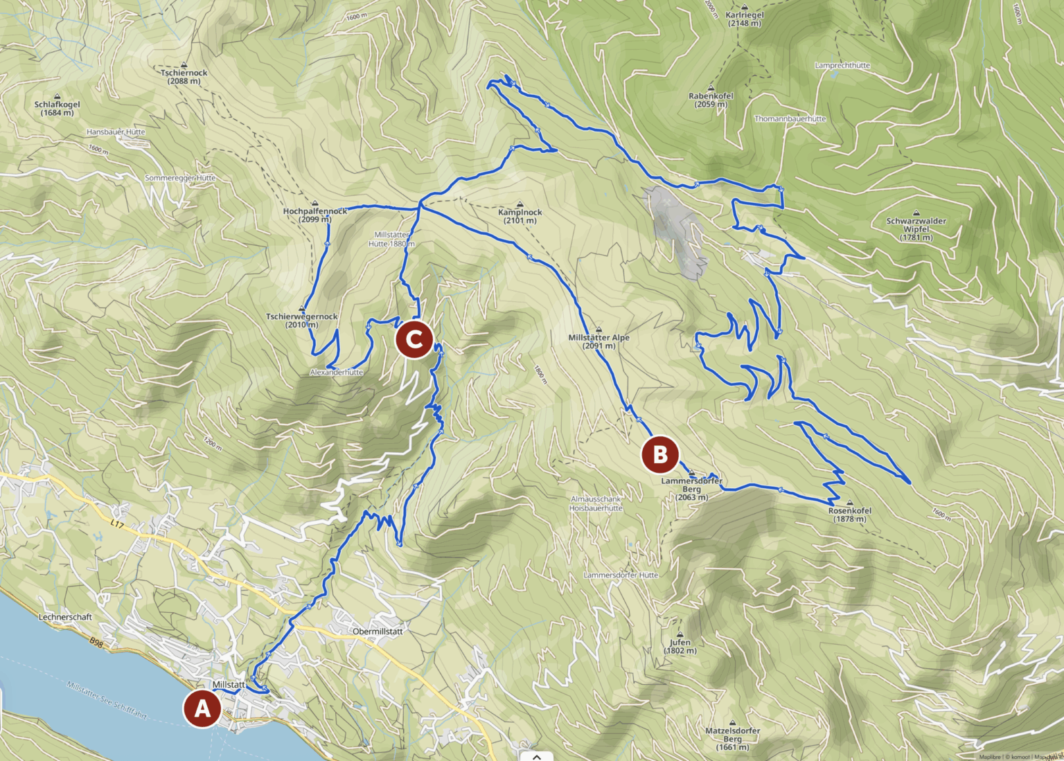 Höhepunkt der Laufstrecke ist das auf 2.060 Metern Seehöhe liegende symbolträchtige Granattor (B). Ziel ist die auf 1.625 Metern Seehöhe gelegene Schwaigerhütte (C), die auch für Betreuer und Zuschauer mit dem Auto erreichbar ist.