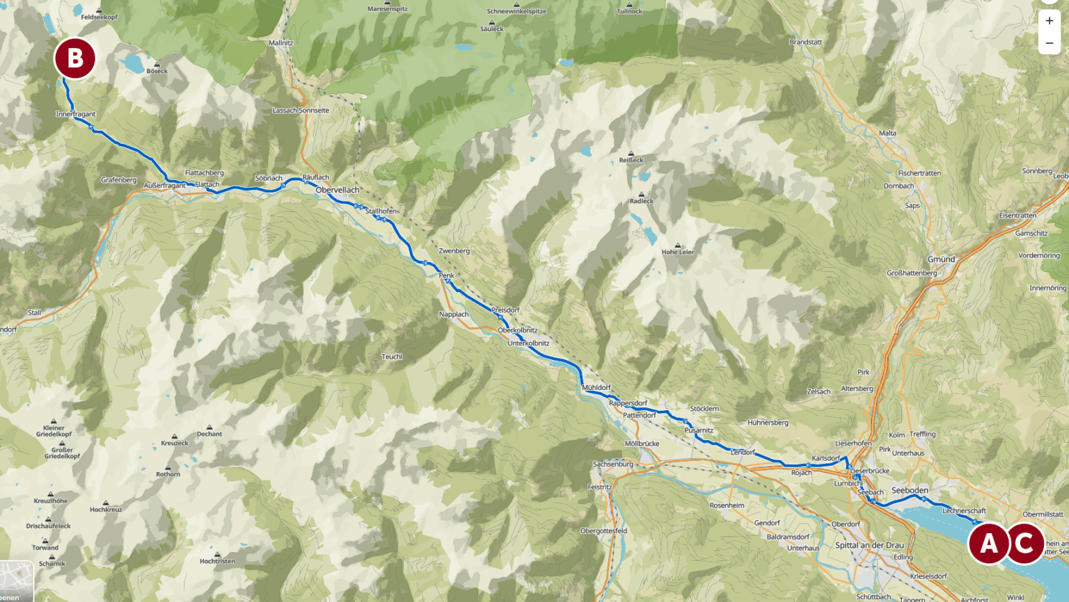 Die Halbdistanz-Radstrecke des Granat Xtreme Triathlon führt die Athlet:innen von der Wechselzone am Millstätter See (A) durch das Mölltal in Richtung Nationalpark Hohe Tauern. Nach ca. 40 km biegen die Halbdistanz- Athlet:innen ab in Richtung Mölltaler Gletscher und beginnen mit dem Anstieg zur Talstation auf 1.223 Metern Seehöhe (B). Von dort geht es auf derselben Route zurück nach Millstatt, zur selben Wechselzone wie schon nach dem Schwimmen (C).