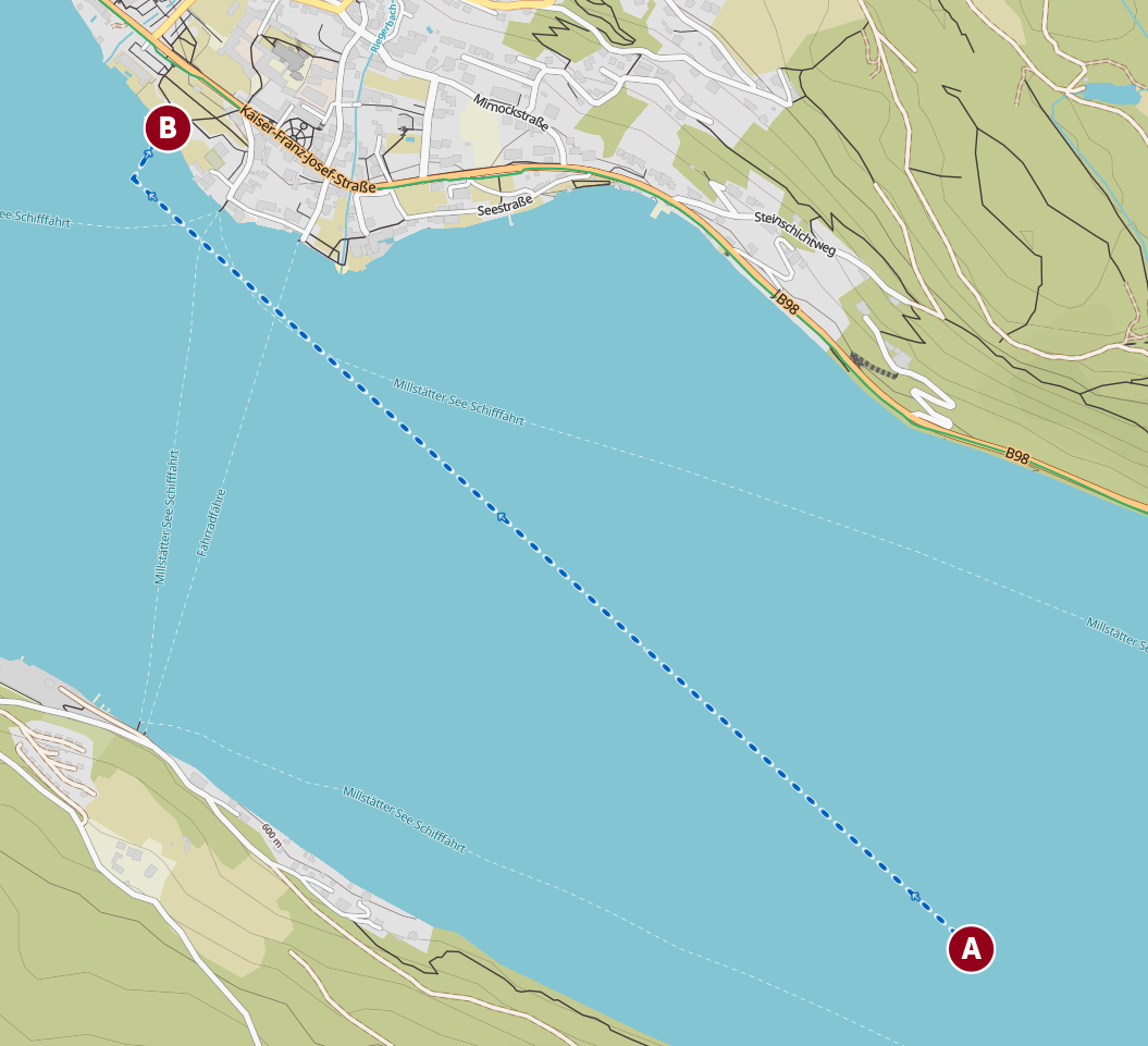 Der Bewerb startet um 06.00 Uhr mit dem Schwimmen im Millstätter See. Der Einstieg erfolgt spektakulär durch einen Sprung von einem Boot (A). Die Schwimmstrecke führt über eine Distanz von 2,0 Kilometern. Das Ziel befindet sich im Strandbad Millstatt in unmittelbarer Nähe vom Zentrum (B), wird durch starke Scheinwerfer beleuchtet und ist somit auch vom Startpunkt aus zu sehen. Das Gelände um das Strandbad dient in weiterer Folge auch als Wechselzone.
